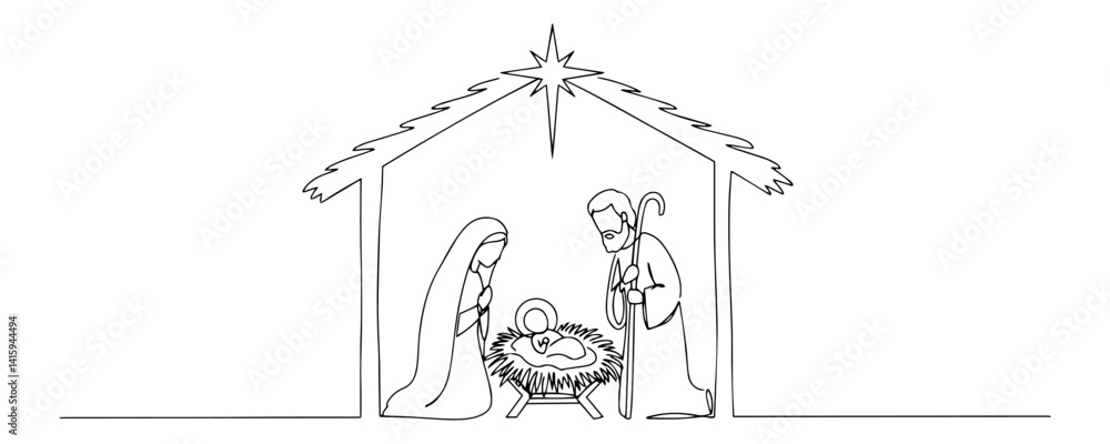 Foto One‑line illustration of the Holy Family in a humble stable – baby Jesus in a ma