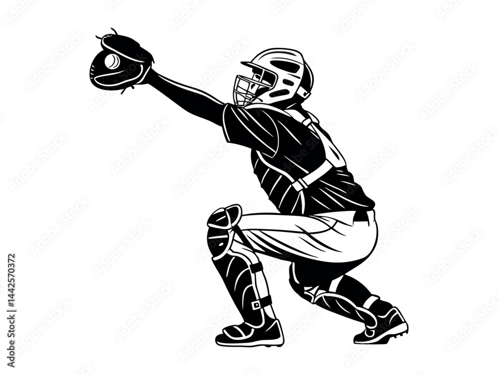 Foto Baseball Catcher in Action Silhouette, A dynamic, black and white silhouette of a baseball catcher in a crouched stance, preparing to catch a ball
