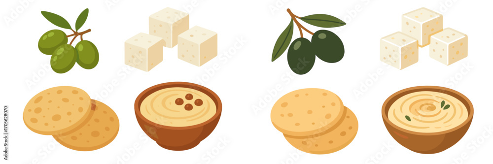 Foto Assortment of Mediterranean food items including green and black olives, feta ch