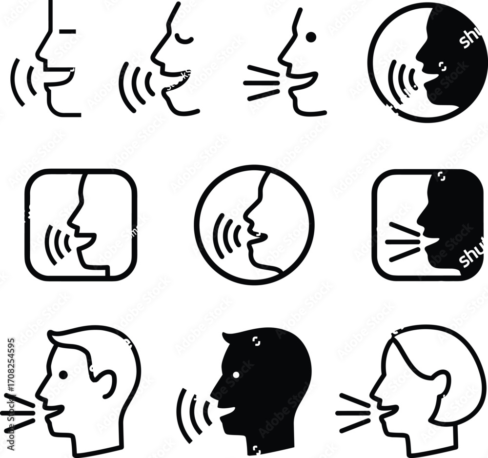 Foto Speaking icons, voice command symbols, communication graphics, sound wave profil