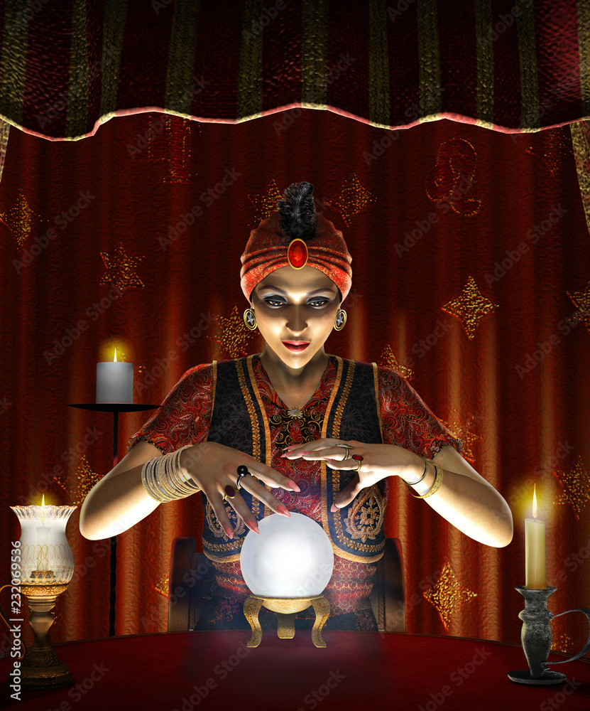 Foto Mystic female Gypsy fortune teller with a lighted crystal ball