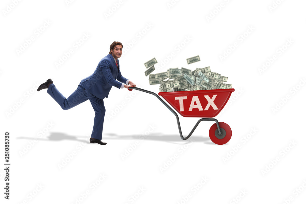 Foto Businessman pushing wheelbarrow full of money in tax concept