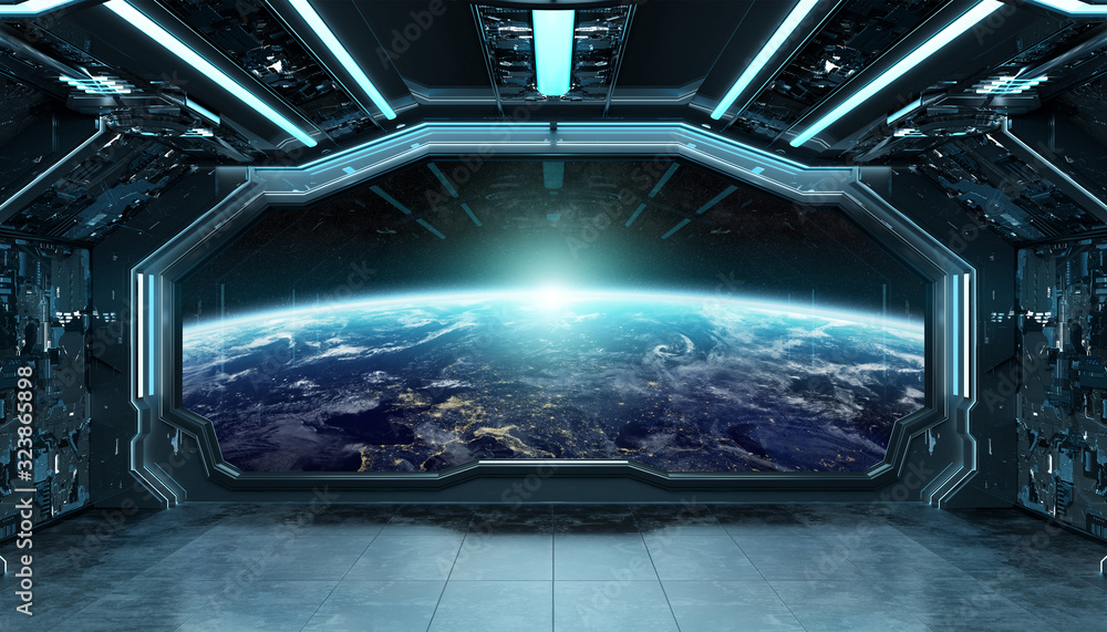 Foto Dark blue spaceship futuristic interior with window view on planet Earth 3d rend