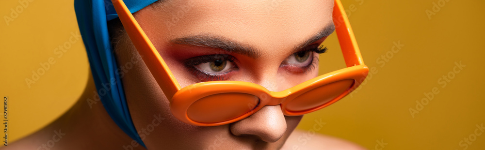 Foto panoramic shot of fashionable girl in scarf and trendy sunglasses, isolated on y