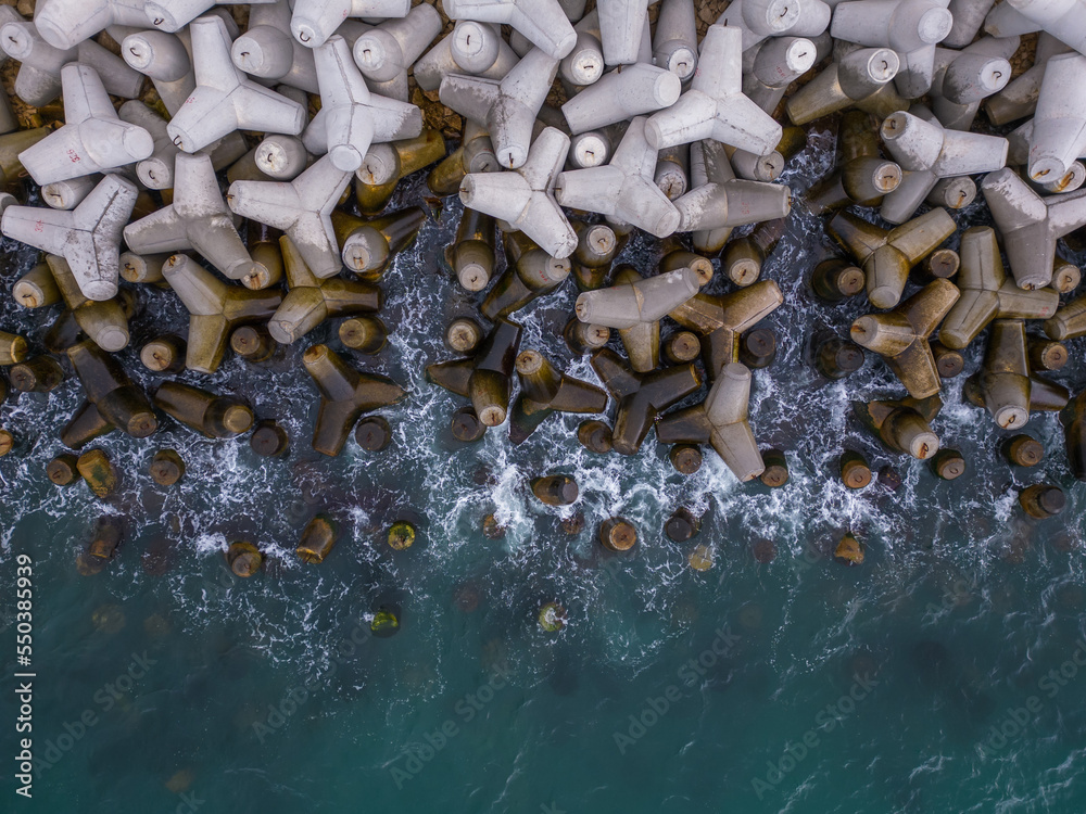 Foto Aerial drone view of a breakwater