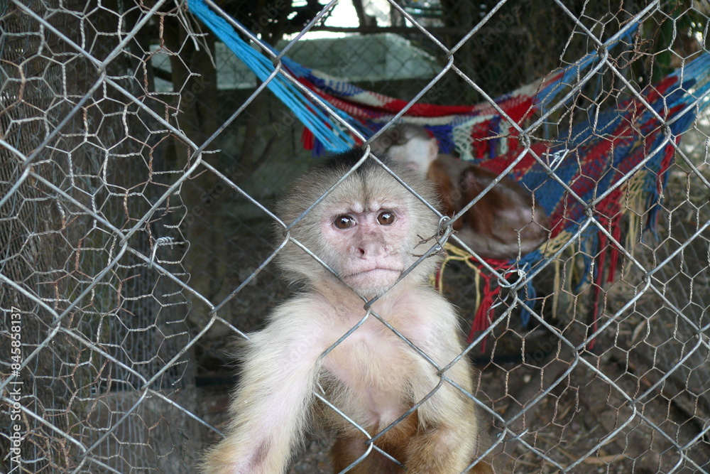 Foto mono titi en cautiverio se acerca a la reja para pedir comida, con expresion de
