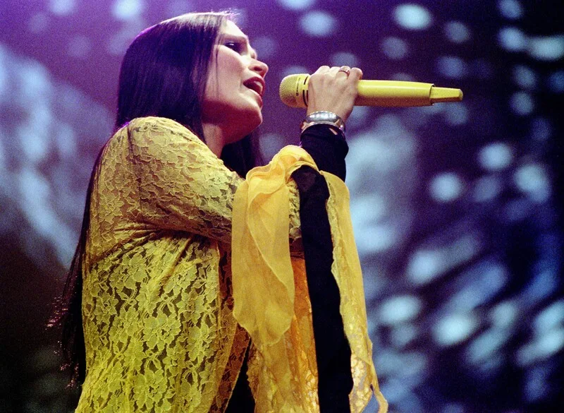 NETHERLANDS - AUGUST 20: LOWLANDS FESTIVAL Photo of NIGHTWISH, Nightwish, Nederland, Lowlands,, Biddinghuizen, 20 augustus 2005, Pop, gothic, de zangeres, gekleed in een lang geel gewaad, zingt tegen een achtergrond van mooie paarse, en witte lichtvlekken (Photo by Peter Pakvis/Redferns)