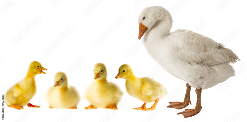 Schilderij op canvas white goose and goslings (Anser anser domesticus) isolated on a white background