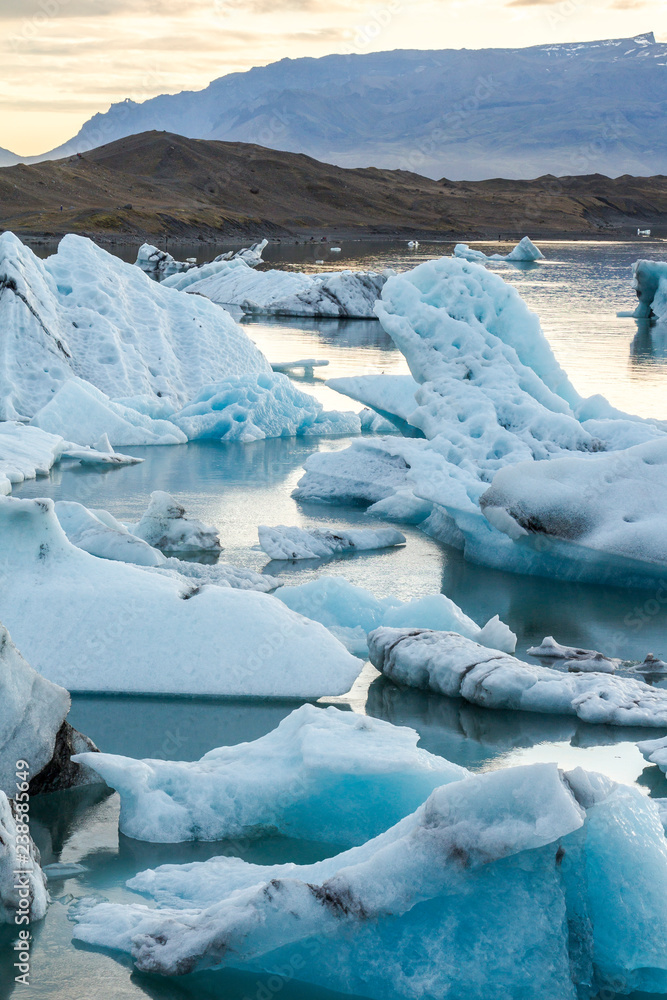 Schilderij op canvas Eisbergs in glacier lagoon Jokulsarlon before sunset, Iceland