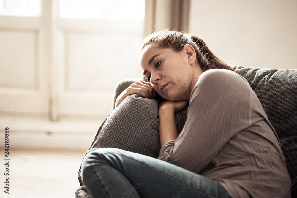 Schilderij op canvas Young woman suffering from depression feeling sad and lonely on sofa at home