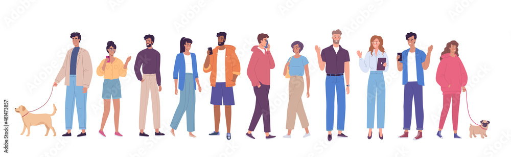 Schilderij op canvas Different characters of people stand together, walk, communicate, walk dogs