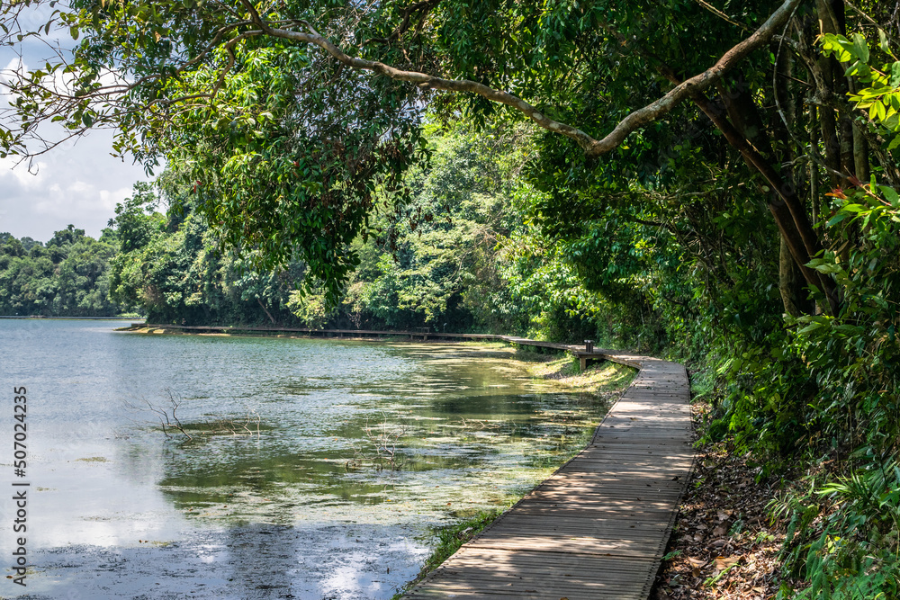 Schilderij op canvas Wooden Trail by Lake in Southeast Asian Jungle / Singapore National Park (Summer