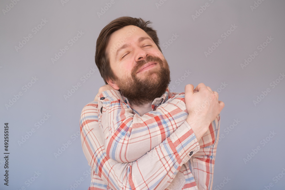 Foto Caucasian man with beard hugging oneself happy and positive, smiling confident