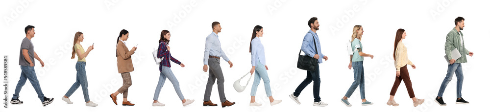 Foto Collage with photos of people wearing stylish outfit walking on white background