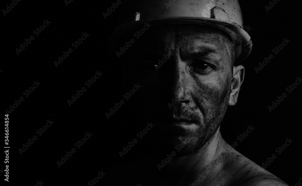 Foto Dirty coal miner in a yellow hard hat on a dark background in a black and white photo