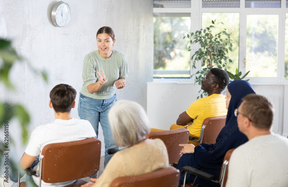 Foto Emotional young female tutor leading educational class for multiethnic adult gro