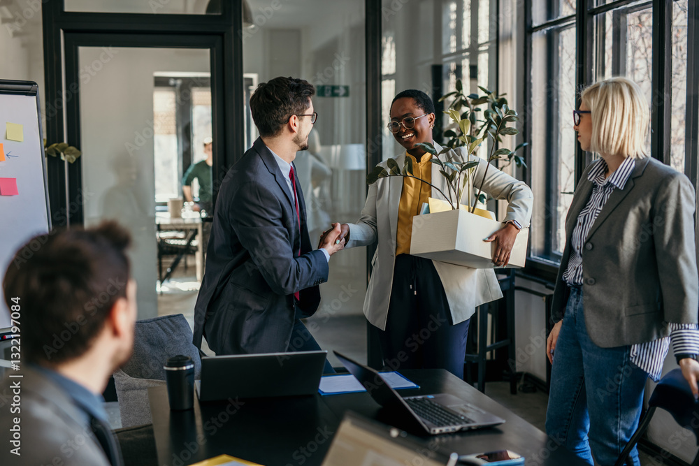Behang A group of coworkers is saying goodbye to an old colleague who is leaving the office