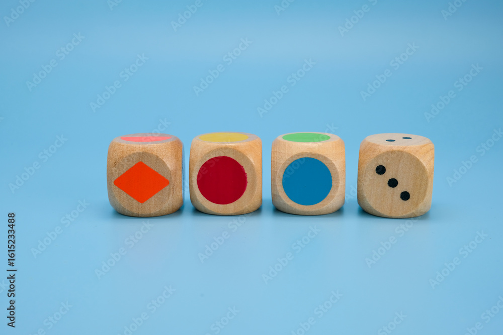 Behang Four wooden dice with vibrant colors and simple shapes colored circles, a diamond shape, and number dots placed in a row on a light blue background