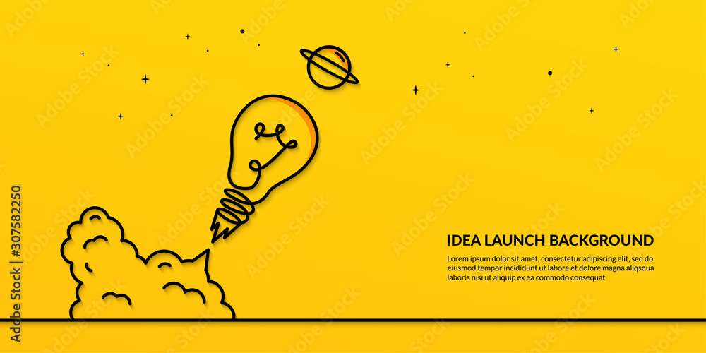 Behang Light bulb launching to space on yellow background, flat start up idea concept