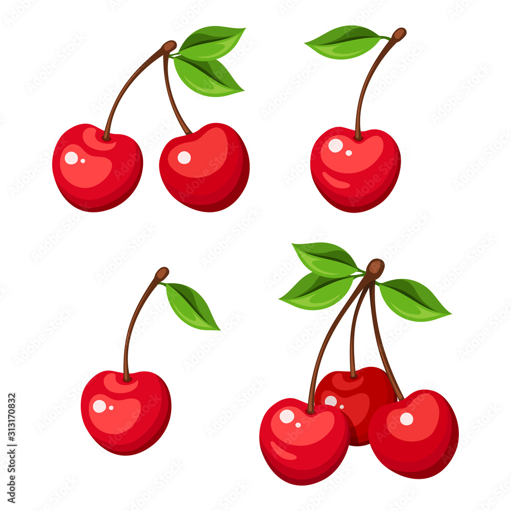 Behang Vector illustration of four cherry berries and bunches of cherry isolated on a white background