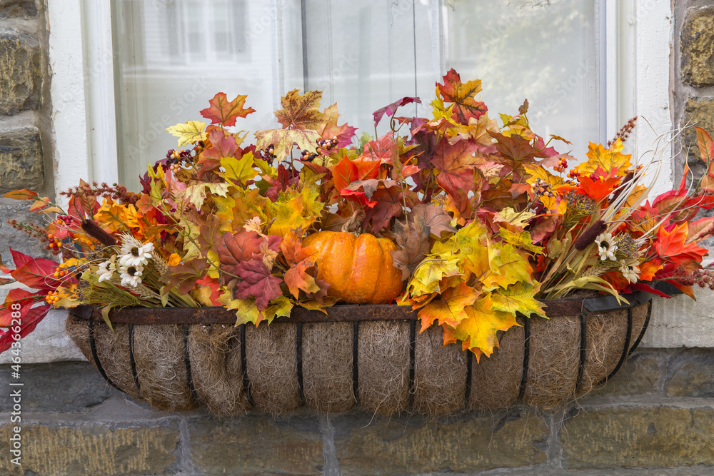 Behang A Fall Themed Moss Lined Window Flower Box Filled With Orange, Red and Yellow L