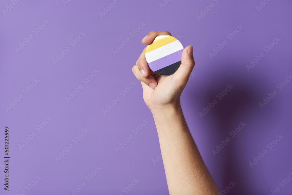 Behang Hand raising a non binary flag badge; gender diversity, identity pride