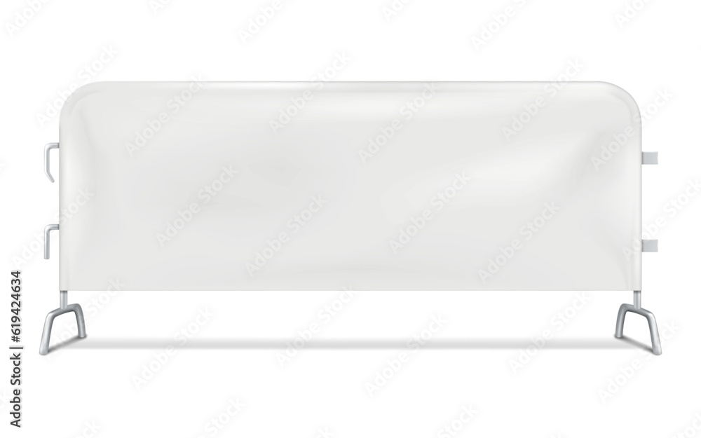Behang Blank white barricade advertising graphic cover on metal frame with hooks vector mockup