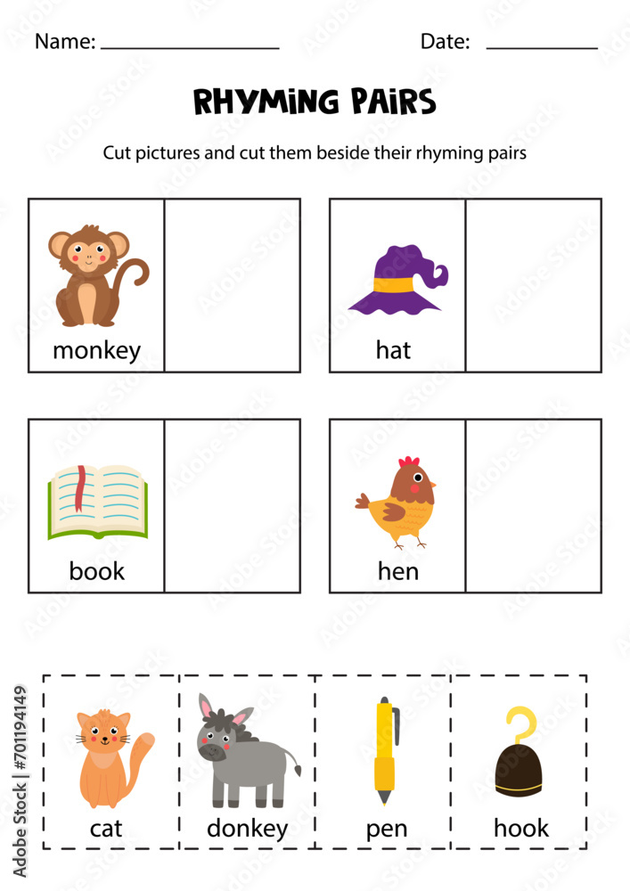 Behang Find rhyming pairs. Educational worksheet. Cut and paste.