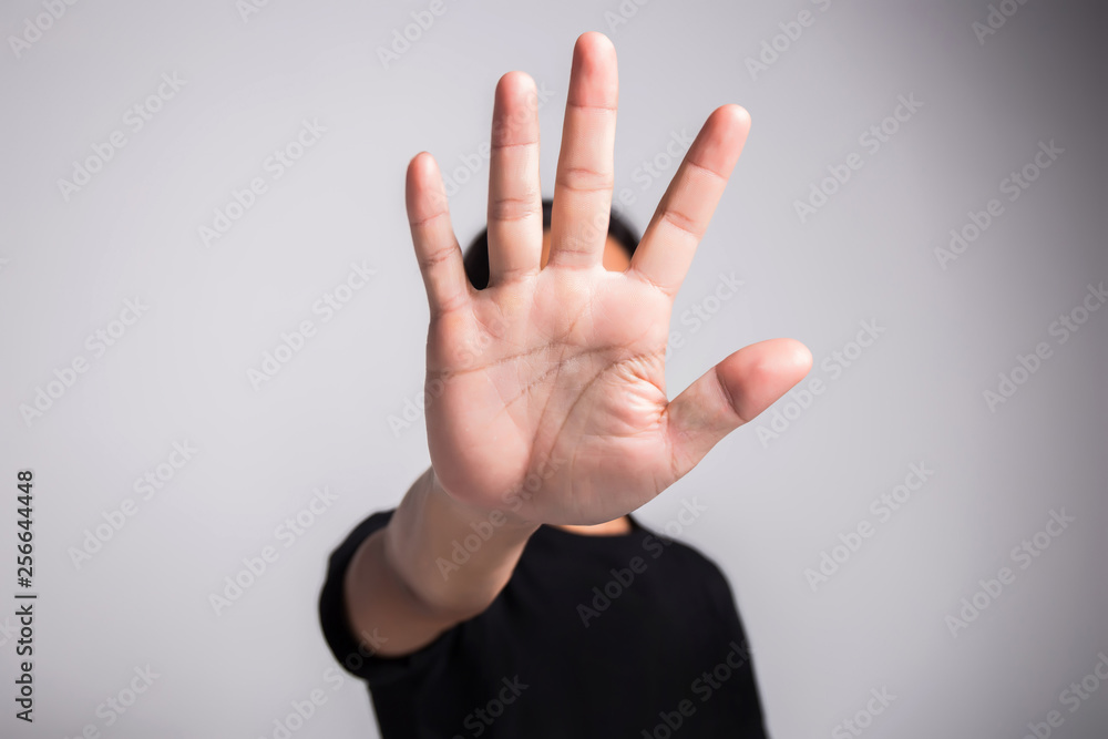 Foto Hand of young man implying NO sign, rejecting expression or prevention