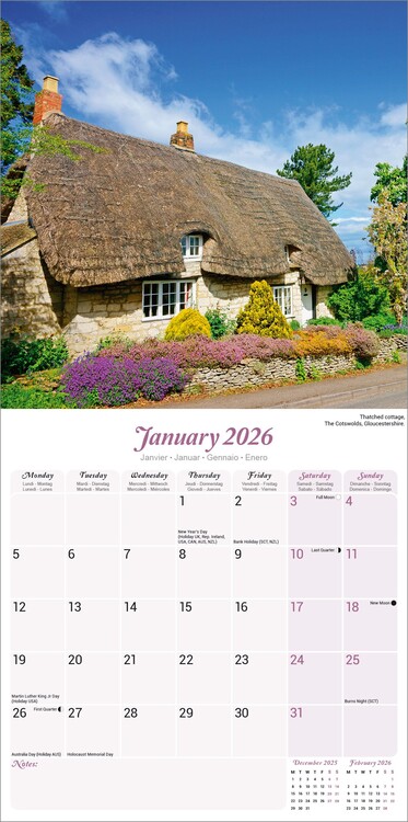 • De kalender is in het Engels en bevat daarom alleen Engelse feestdagen