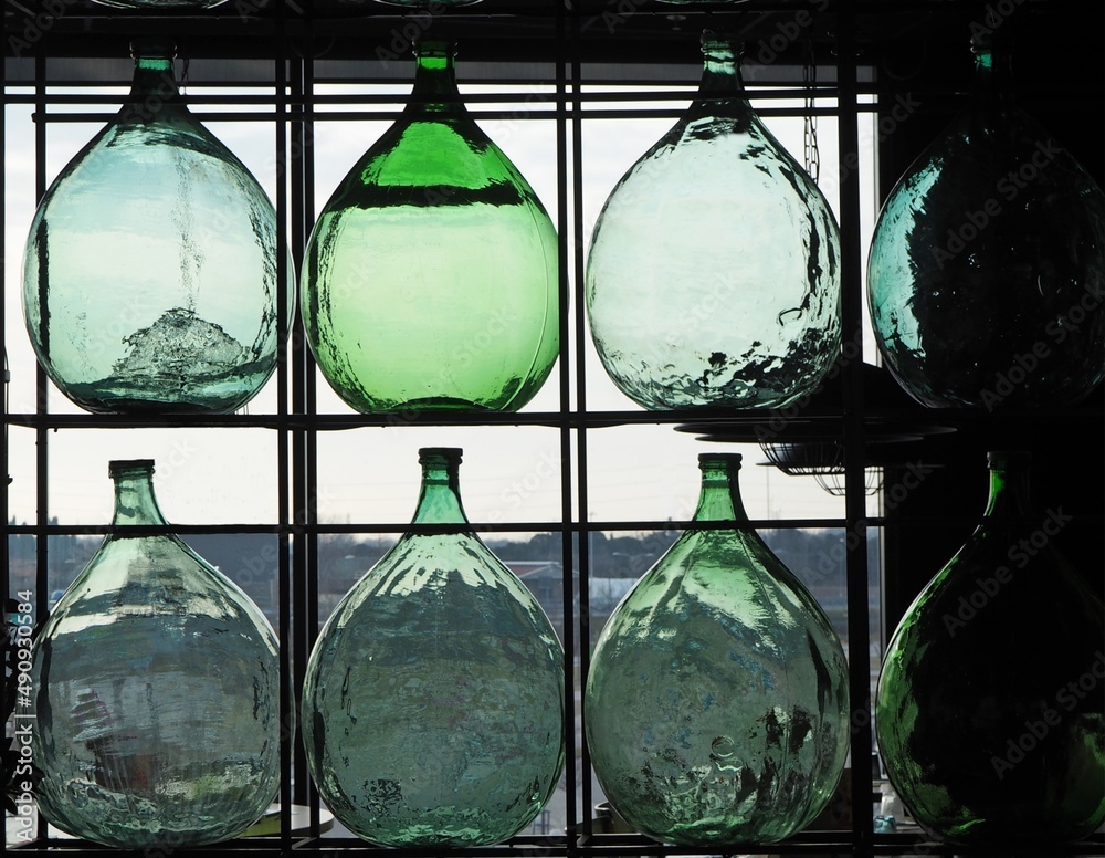 Foto Large glass demijohns for wine against the light of a window