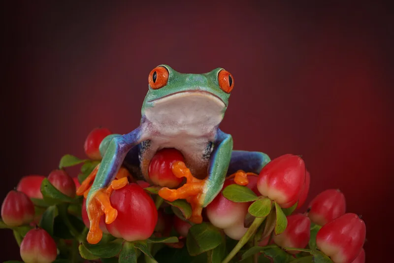 Sticker Red eyed tree frog on red berries