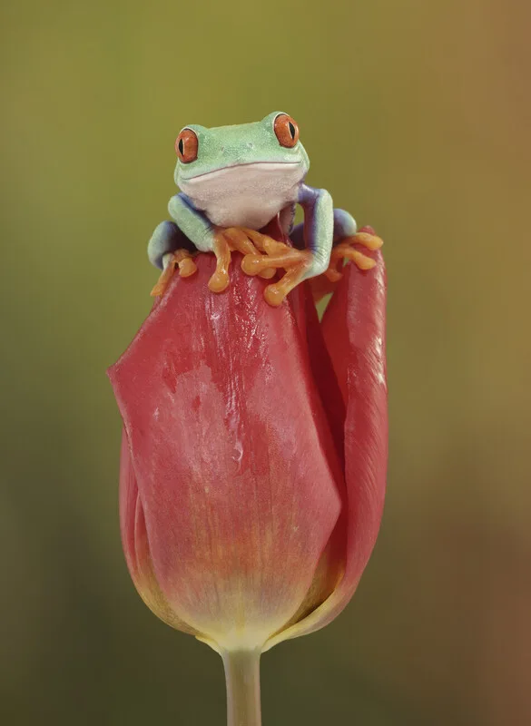 Sticker Red eyed tree frog on red tulip flower