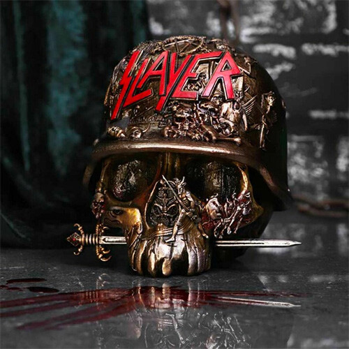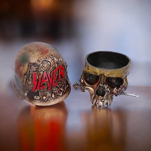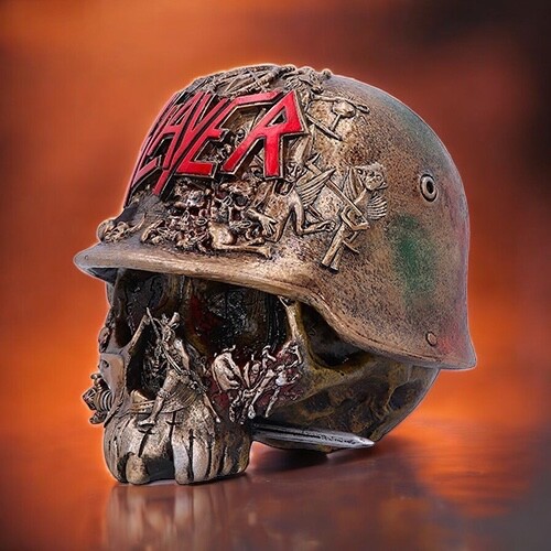 De luxe doos in de vorm van een schedel van Slayer is een stijlvol en functioneel verzamelobject voor fans van de thrashmetallegende. De doos is gemaakt van hars, meet 16 x 16,5 x 17 cm en weegt 1 kg.