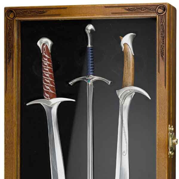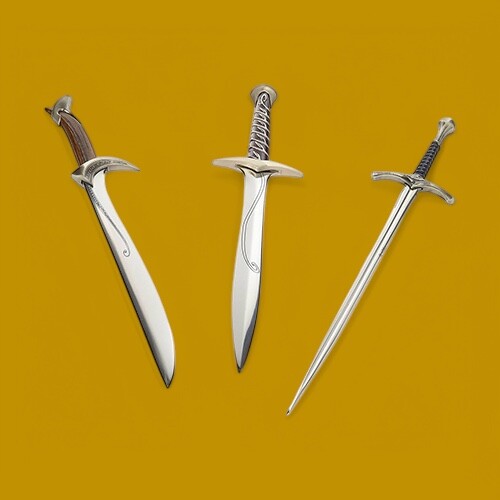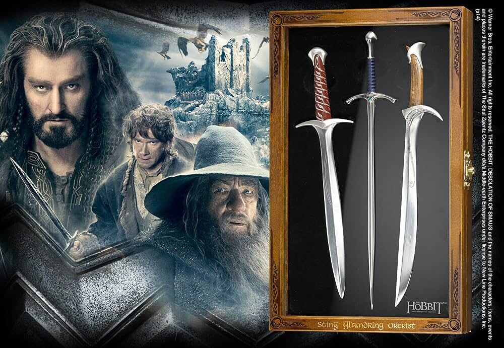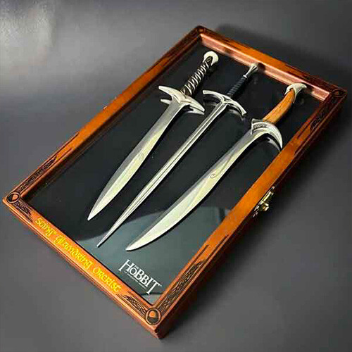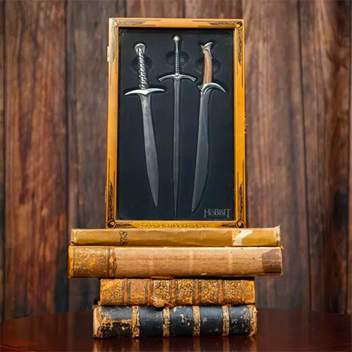 Deze prachtige verzamelaarsset geïnspireerd op de Hobbit-films bevat drie iconische elfenzwaarden in gedetailleerde miniaturen die kunnen worden gebruikt als briefopeners. Elk zwaard meet ongeveer 20 cm.
