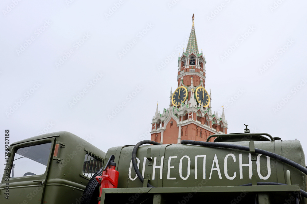 Schilderij op canvas Military fuel truck with the Russian inscription Flammable on Red Square again