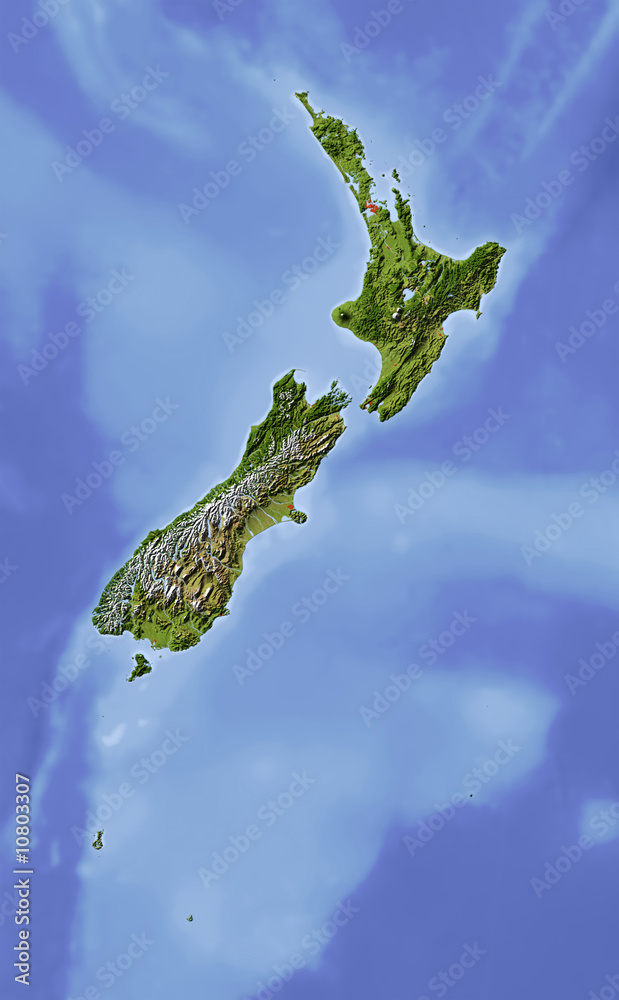 Schilderij op canvas New Zealand, shaded relief map, colored for vegetation.