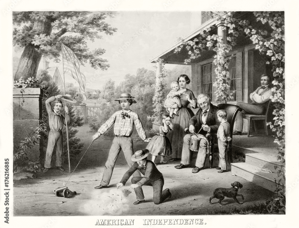 Schilderij op canvas Old illustration depicting American family while boys play American Revolutionary War