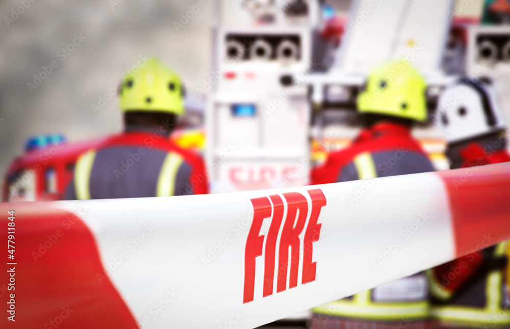 Schilderij op canvas Scene of incident is cordoned off with red and white tape, reading ‘fire’