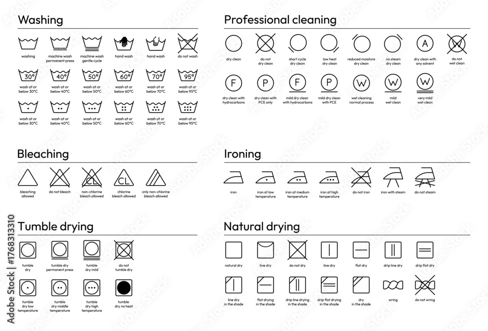 Sticker Minimal laundry care washing icon set for garment labels, including drying, bleaching, ironing, and professional cleaning symbols