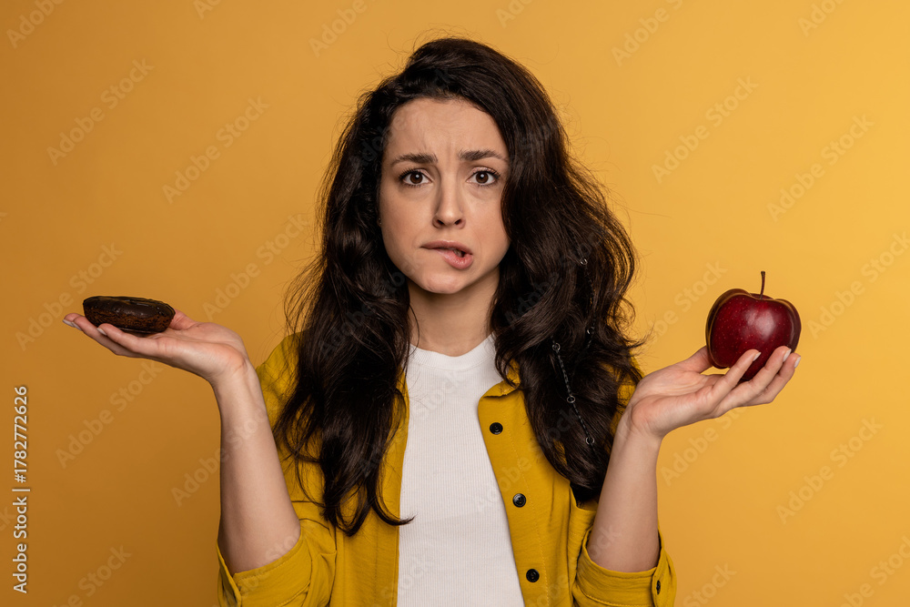 Sticker Confused dark-haired cute lady choosing between a high-calorie cookie and a low-calorie fruit during the studio photo shoot