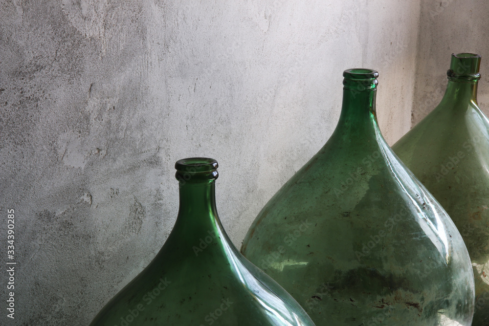 Sticker Primo piano di damigiane in vetro, contenitori per vino o aceto; oggetti vintage