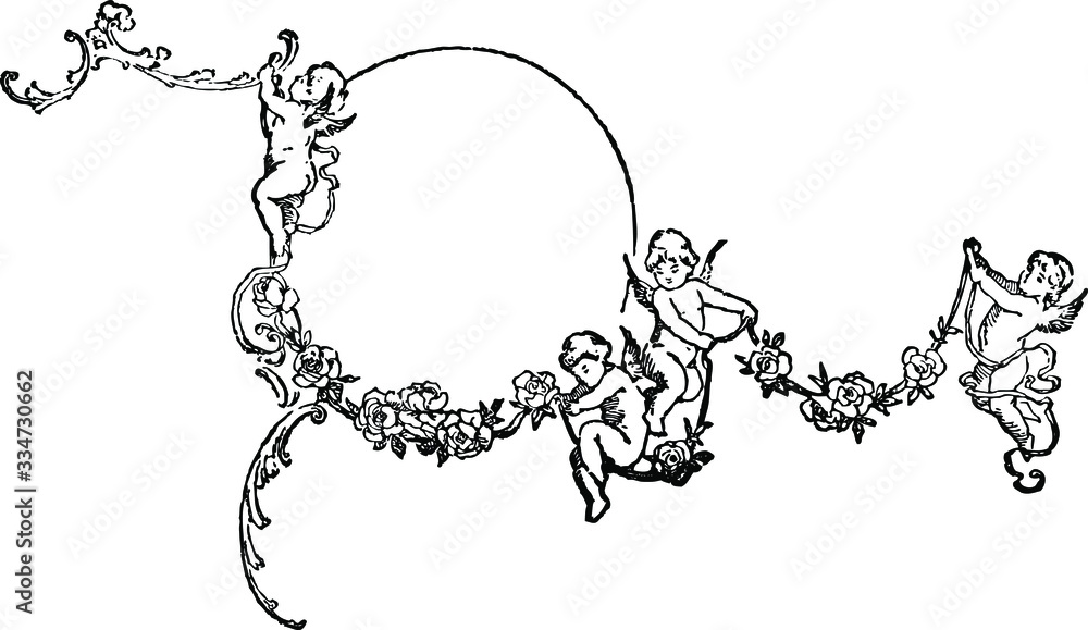 Sticker Cherubs with wreath, empty oval frame Vintage Engraved line art drawing black an