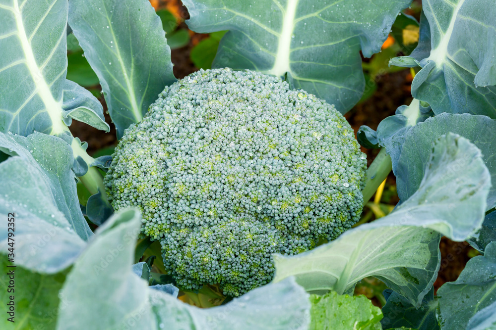 Sticker Close up of fresh broccoli growing in vegetable garden