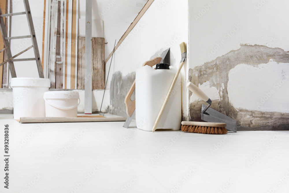Sticker Indoor shot close up frontal view of bricklayer, plasterer or house painter tool