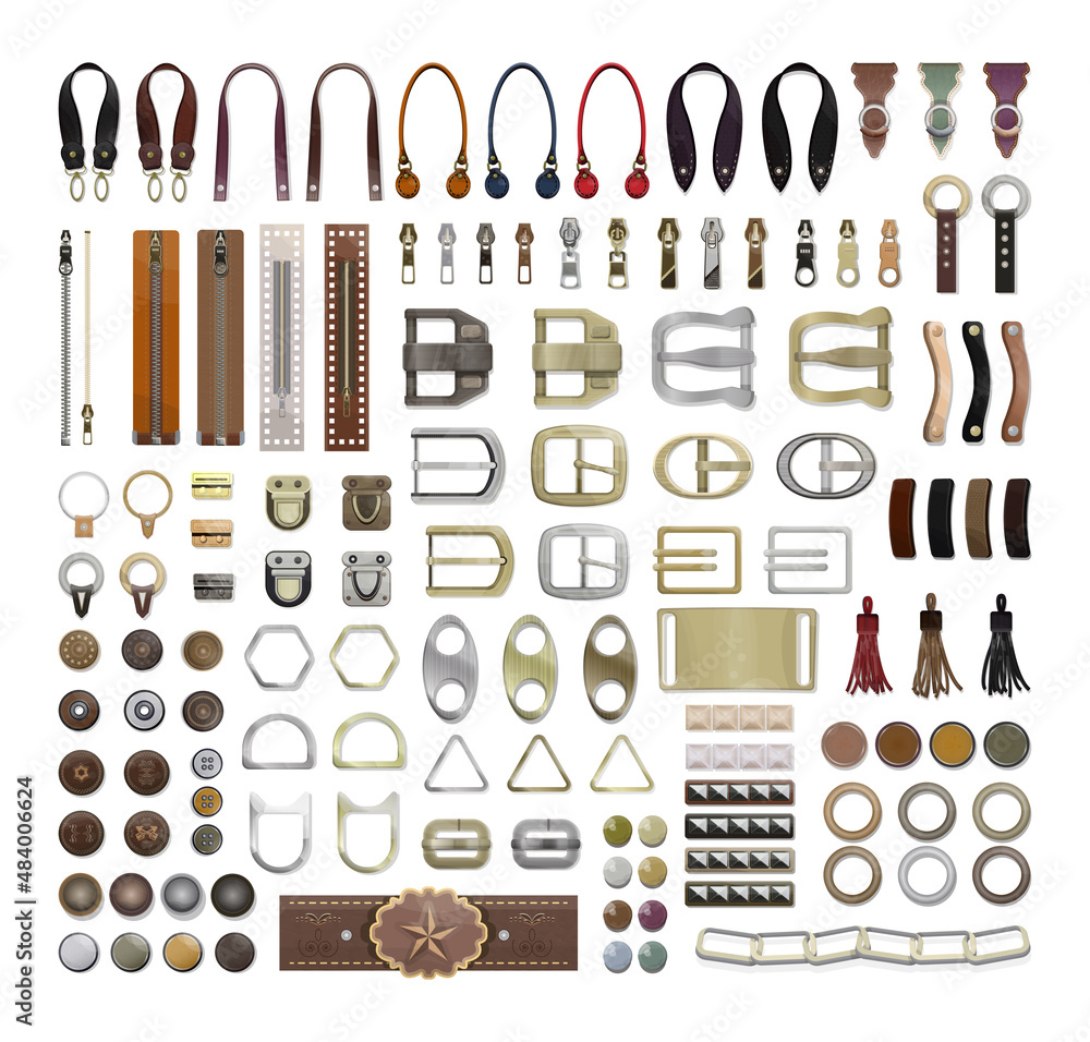 Sticker A collection of leather and metal accessories for decorating and tailoring clothes, shoes, bags