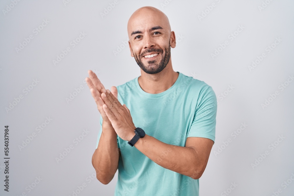 Sticker Middle age bald man standing over white background clapping and applauding happy