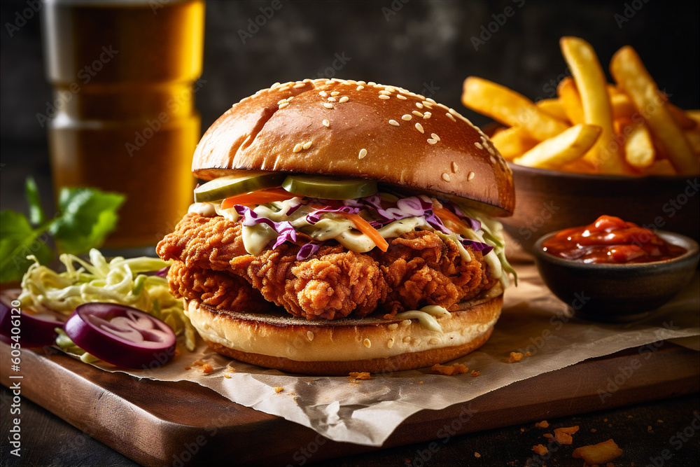 Sticker Crispy fried chicken sandwich with lettuce, tomato on dark background