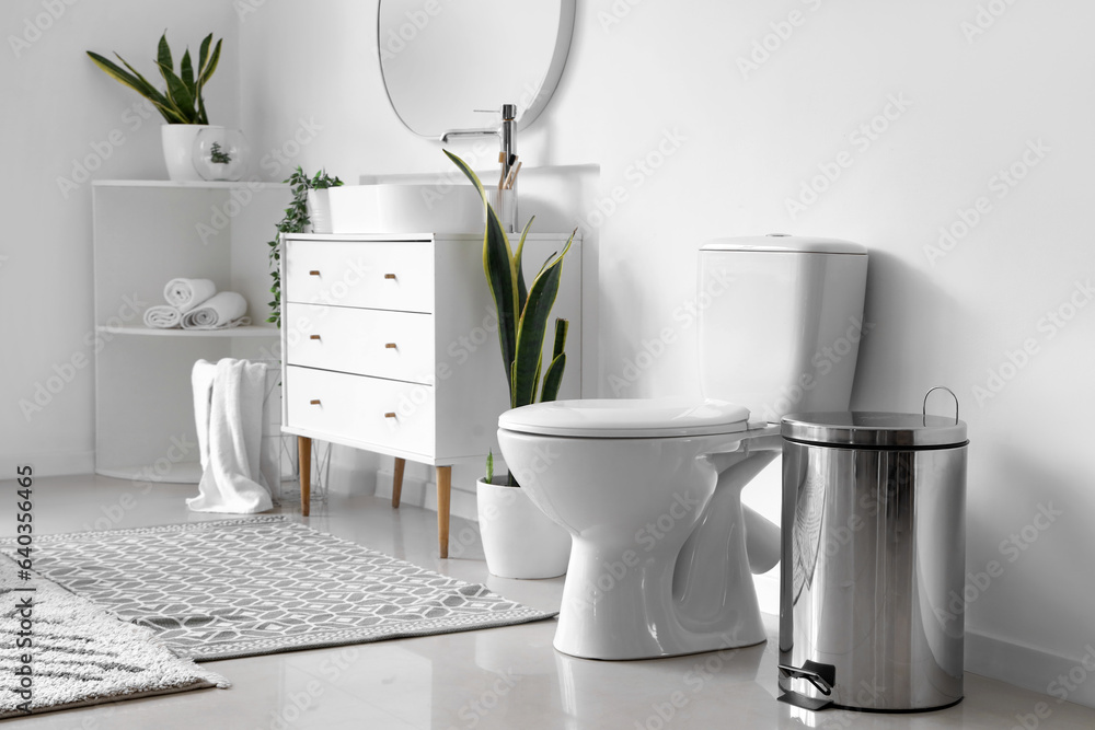 Sticker White toilet bowl and metallic trash bin in interior of light bathroom