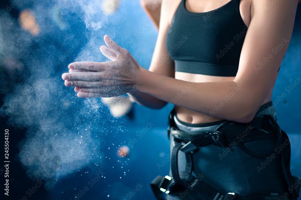 Schilderij op canvas Successful strong self confident sport woman female alpinist climber staying opposite wall before training bouldering on climbing wall